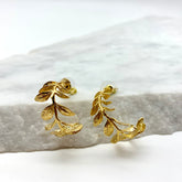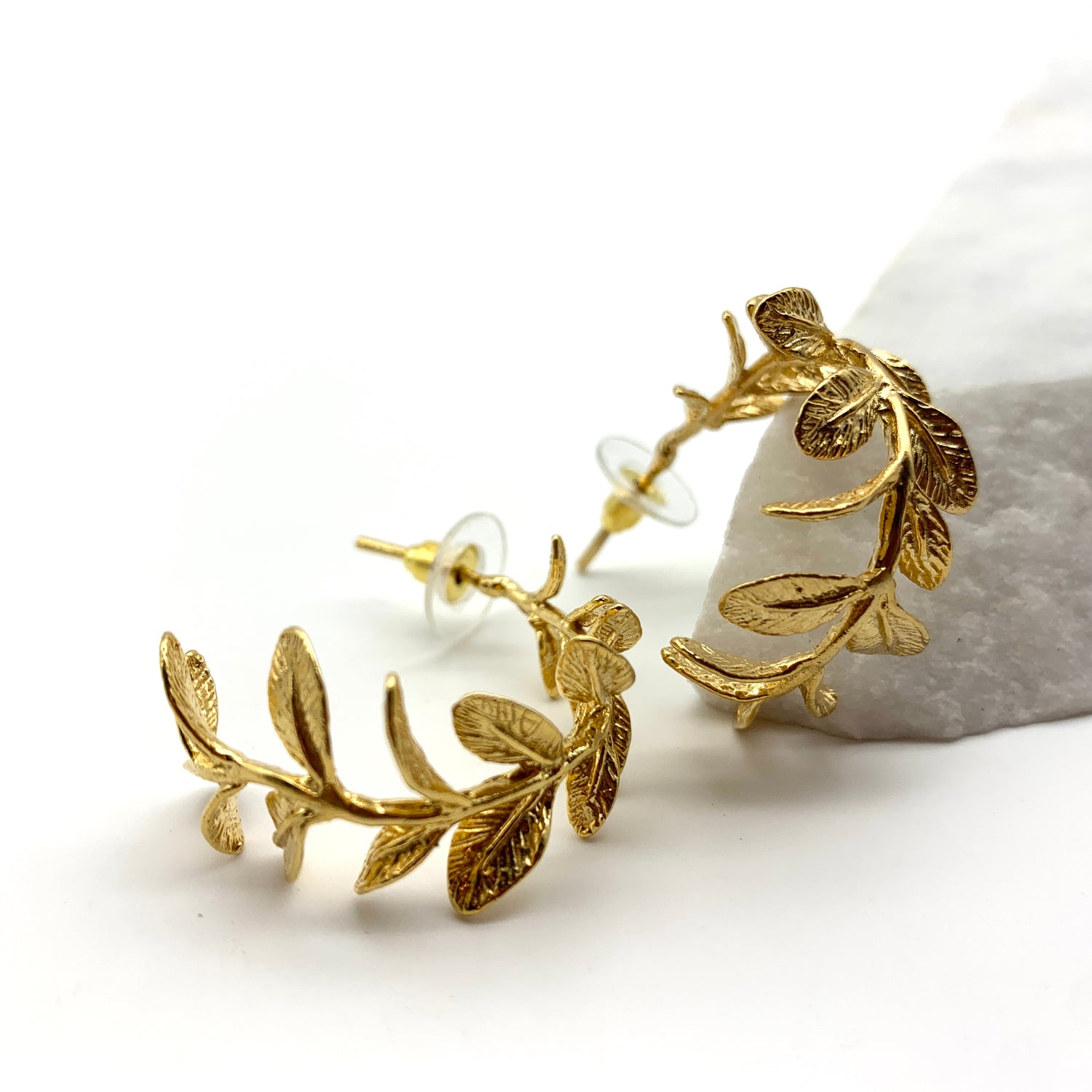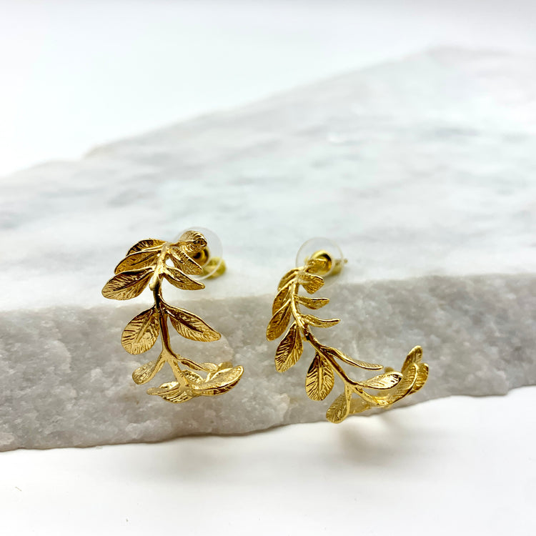 These elegant leaf hoop earrings give away a sleek subtle earthy feel, finished off with a raw organic edge to them. They are supremely elegant in all their simplicity, making them a must have pair of earrings this season.